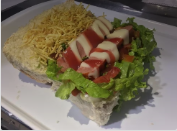 Pão chinelão, Alface, tomate, Catupiry, palmito, milho, queijo, ketchup e maionese.